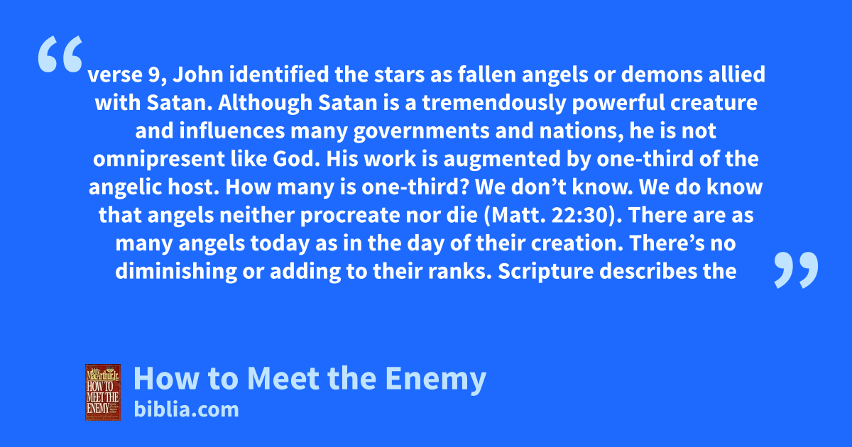 verse 9, John identified the stars as fallen angels or demons allied with Satan. Although Satan is a tremendously powerful creature and influences many governments and nations, he is not omnipresent like God. His work is augmented by one-third of the angelic host. How many is one-third? We don’t know. We do know that angels neither procreate nor die (Matt. 22:30). There are as many angels today as in the day of their creation. There’s no diminishing or adding to their ranks. Scripture describes the