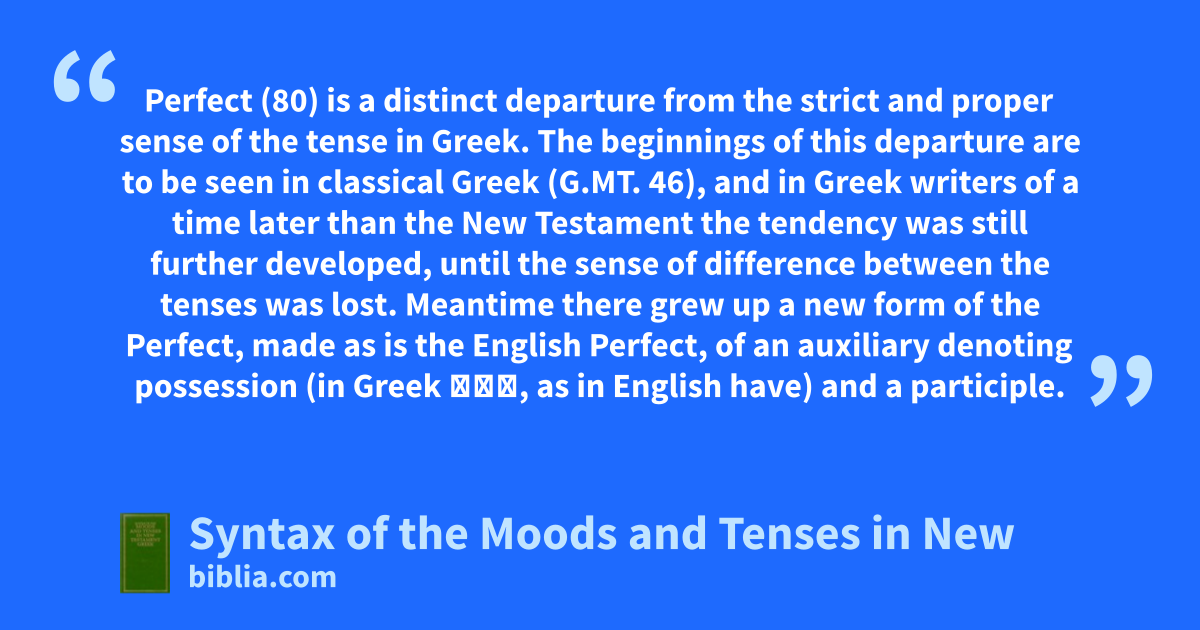 Of Syntax of the Moods and Tenses in New Testament Greek, the author writes: Classified according to its intent, it belongs among the aids to the interpretation of the New Testament. It is designed to assist English-speaking students in the task of translating the Greek New Testament into English forms of thought and expression. The work has not been undertaken under the impression that grammar...
