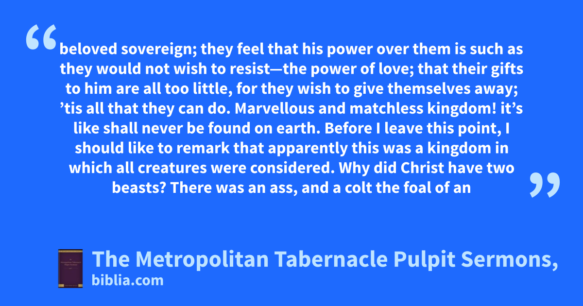 beloved sovereign; they feel that his power over them is such as they would not wish to resist—the power of love; that their gifts to him are all too little, for they wish to give themselves away; ’tis all that they can do. Marvellous and matchless kingdom! it’s like shall never be found on earth. Before I leave this point, I should like to remark that apparently this was a kingdom in which all creatures were considered. Why did Christ have two beasts? There was an ass, and a colt the foal of an