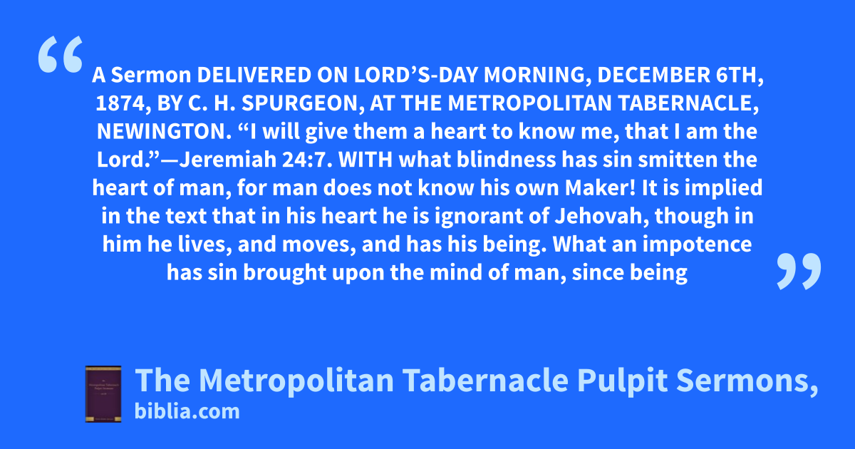 A Sermon DELIVERED ON LORD’S-DAY MORNING, DECEMBER 6TH, 1874, BY C. H. SPURGEON, AT THE METROPOLITAN TABERNACLE, NEWINGTON. “I will give them a heart to know me, that I am the Lord.”—Jeremiah 24:7. WITH what blindness has sin smitten the heart of man, for man does not know his own Maker! It is implied in the text that in his heart he is ignorant of Jehovah, though in him he lives, and moves, and has his being. What an impotence has sin brought upon the mind of man, since being