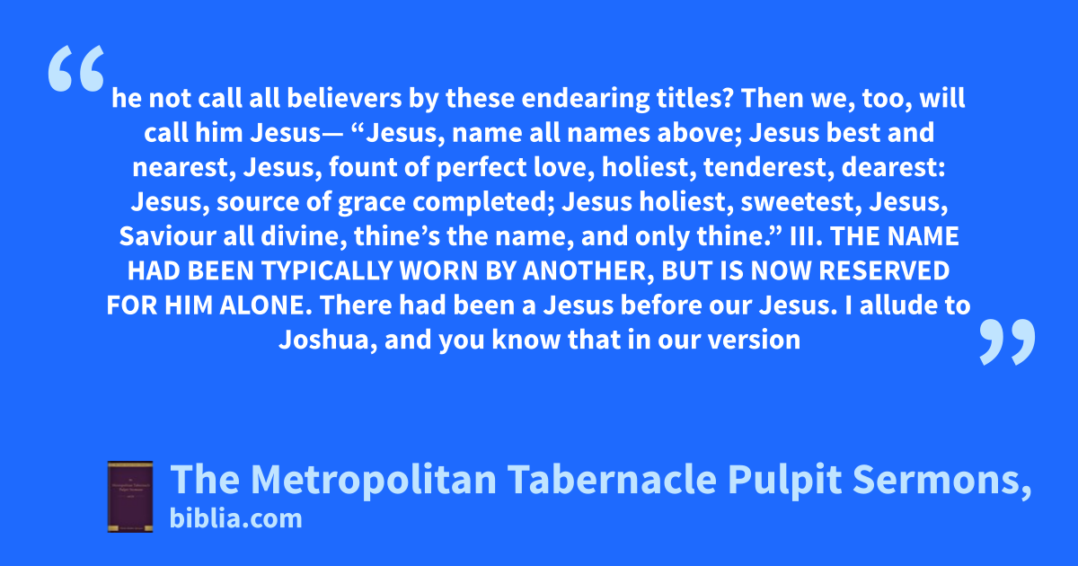 he not call all believers by these endearing titles? Then we, too, will call him Jesus— “Jesus, name all names above; Jesus best and nearest, Jesus, fount of perfect love, holiest, tenderest, dearest: Jesus, source of grace completed; Jesus holiest, sweetest, Jesus, Saviour all divine, thine’s the name, and only thine.” III. THE NAME HAD BEEN TYPICALLY WORN BY ANOTHER, BUT IS NOW RESERVED FOR HIM ALONE. There had been a Jesus before our Jesus. I allude to Joshua, and you know that in our version
