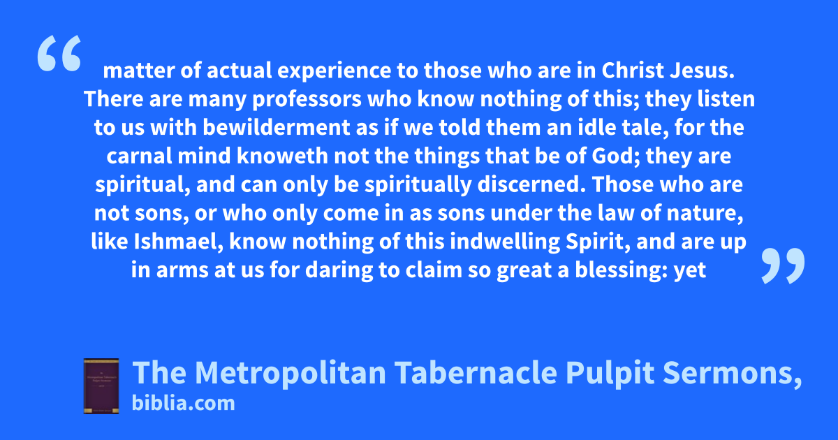 matter of actual experience to those who are in Christ Jesus. There are many professors who know nothing of this; they listen to us with bewilderment as if we told them an idle tale, for the carnal mind knoweth not the things that be of God; they are spiritual, and can only be spiritually discerned. Those who are not sons, or who only come in as sons under the law of nature, like Ishmael, know nothing of this indwelling Spirit, and are up in arms at us for daring to claim so great a blessing: yet