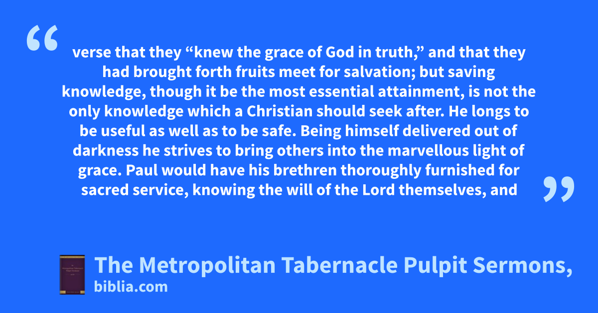 verse that they “knew the grace of God in truth,” and that they had brought forth fruits meet for salvation; but saving knowledge, though it be the most essential attainment, is not the only knowledge which a Christian should seek after. He longs to be useful as well as to be safe. Being himself delivered out of darkness he strives to bring others into the marvellous light of grace. Paul would have his brethren thoroughly furnished for sacred service, knowing the will of the Lord themselves, and