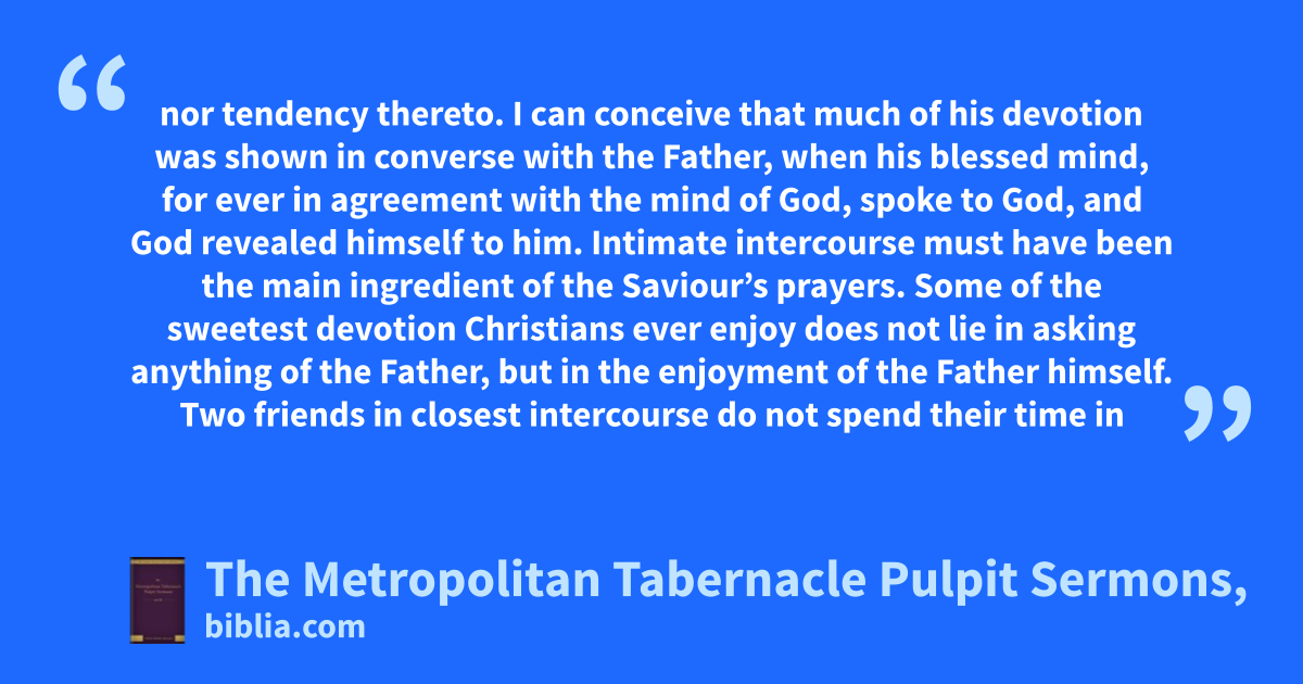 nor tendency thereto. I can conceive that much of his devotion was shown in converse with the Father, when his blessed mind, for ever in agreement with the mind of God, spoke to God, and God revealed himself to him. Intimate intercourse must have been the main ingredient of the Saviour’s prayers. Some of the sweetest devotion Christians ever enjoy does not lie in asking anything of the Father, but in the enjoyment of the Father himself. Two friends in closest intercourse do not spend their time in