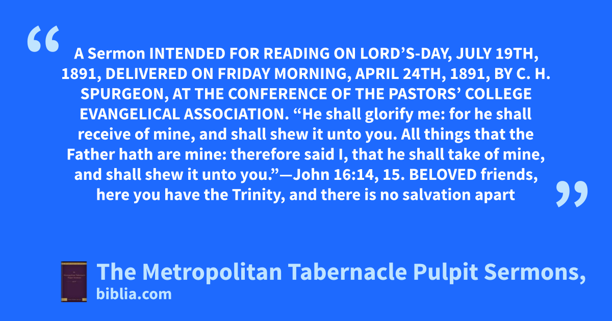 A Sermon INTENDED FOR READING ON LORD’S-DAY, JULY 19TH, 1891, DELIVERED ON FRIDAY MORNING, APRIL 24TH, 1891, BY C. H. SPURGEON, AT THE CONFERENCE OF THE PASTORS’ COLLEGE EVANGELICAL ASSOCIATION. “He shall glorify me: for he shall receive of mine, and shall shew it unto you. All things that the Father hath are mine: therefore said I, that he shall take of mine, and shall shew it unto you.”—John 16:14, 15. BELOVED friends, here you have the Trinity, and there is no salvation apart