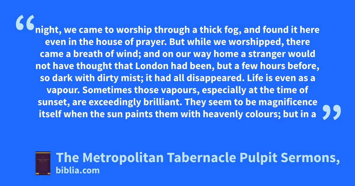 night, we came to worship through a thick fog, and found it here even in the house of prayer. But while we worshipped, there came a breath of wind; and on our way home a stranger would not have thought that London had been, but a few hours before, so dark with dirty mist; it had all disappeared. Life is even as a vapour. Sometimes those vapours, especially at the time of sunset, are exceedingly brilliant. They seem to be magnificence itself when the sun paints them with heavenly colours; but in a