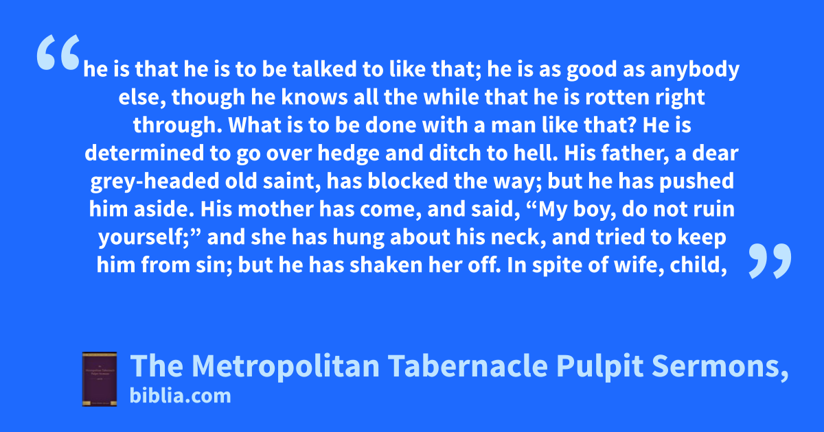 he is that he is to be talked to like that; he is as good as anybody else, though he knows all the while that he is rotten right through. What is to be done with a man like that? He is determined to go over hedge and ditch to hell. His father, a dear grey-headed old saint, has blocked the way; but he has pushed him aside. His mother has come, and said, “My boy, do not ruin yourself;” and she has hung about his neck, and tried to keep him from sin; but he has shaken her off. In spite of wife, child,