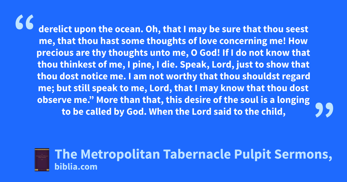 derelict upon the ocean. Oh, that I may be sure that thou seest me, that thou hast some thoughts of love concerning me! How precious are thy thoughts unto me, O God! If I do not know that thou thinkest of me, I pine, I die. Speak, Lord, just to show that thou dost notice me. I am not worthy that thou shouldst regard me; but still speak to me, Lord, that I may know that thou dost observe me.” More than that, this desire of the soul is a longing to be called by God. When the Lord said to the child,
