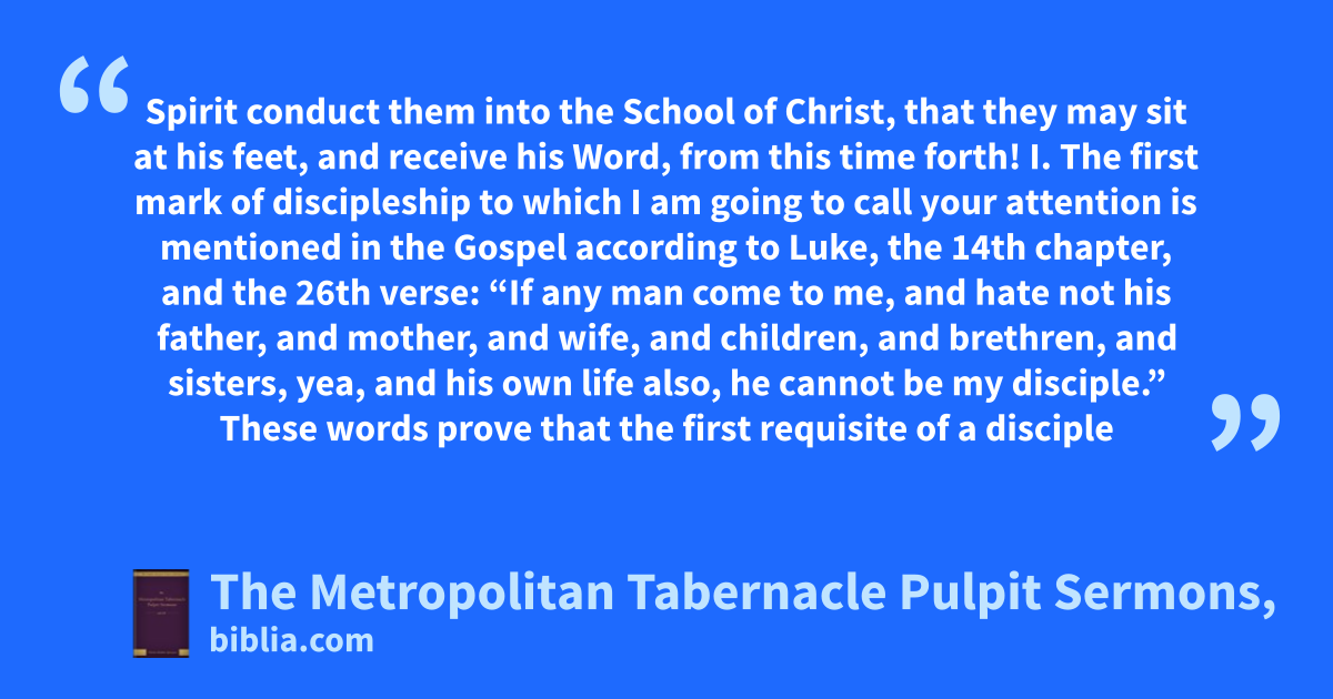 Spirit conduct them into the School of Christ, that they may sit at his feet, and receive his Word, from this time forth! I. The first mark of discipleship to which I am going to call your attention is mentioned in the Gospel according to Luke, the 14th chapter, and the 26th verse: “If any man come to me, and hate not his father, and mother, and wife, and children, and brethren, and sisters, yea, and his own life also, he cannot be my disciple.” These words prove that the first requisite of a disciple