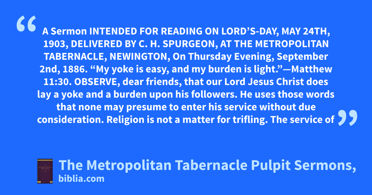 A Sermon INTENDED FOR READING ON LORD’S-DAY, MAY 24TH, 1903, DELIVERED BY C. H. SPURGEON, AT THE METROPOLITAN TABERNACLE, NEWINGTON, On Thursday Evening, September 2nd, 1886. “My yoke is easy, and my burden is light.”—Matthew 11:30. OBSERVE, dear friends, that our Lord Jesus Christ does lay a yoke and a burden upon his followers. He uses those words that none may presume to enter his service without due consideration. Religion is not a matter for trifling. The service of