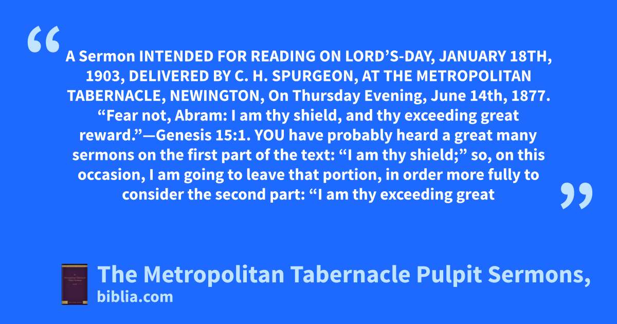 A Sermon INTENDED FOR READING ON LORD’S-DAY, JANUARY 18TH, 1903, DELIVERED BY C. H. SPURGEON, AT THE METROPOLITAN TABERNACLE, NEWINGTON, On Thursday Evening, June 14th, 1877. “Fear not, Abram: I am thy shield, and thy exceeding great reward.”—Genesis 15:1. YOU have probably heard a great many sermons on the first part of the text: “I am thy shield;” so, on this occasion, I am going to leave that portion, in order more fully to consider the second part: “I am thy exceeding great