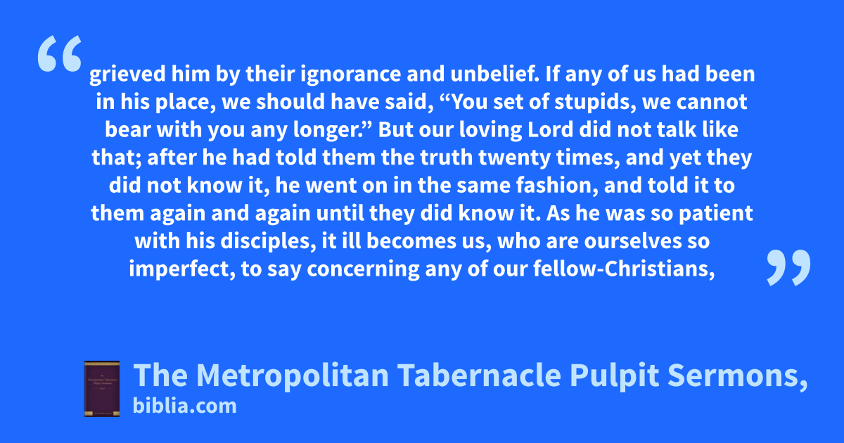 grieved him by their ignorance and unbelief. If any of us had been in his place, we should have said, “You set of stupids, we cannot bear with you any longer.” But our loving Lord did not talk like that; after he had told them the truth twenty times, and yet they did not know it, he went on in the same fashion, and told it to them again and again until they did know it. As he was so patient with his disciples, it ill becomes us, who are ourselves so imperfect, to say concerning any of our fellow-Christians,