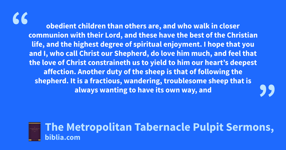 obedient children than others are, and who walk in closer communion with their Lord, and these have the best of the Christian life, and the highest degree of spiritual enjoyment. I hope that you and I, who call Christ our Shepherd, do love him much, and feel that the love of Christ constraineth us to yield to him our heart’s deepest affection. Another duty of the sheep is that of following the shepherd. It is a fractious, wandering, troublesome sheep that is always wanting to have its own way, and