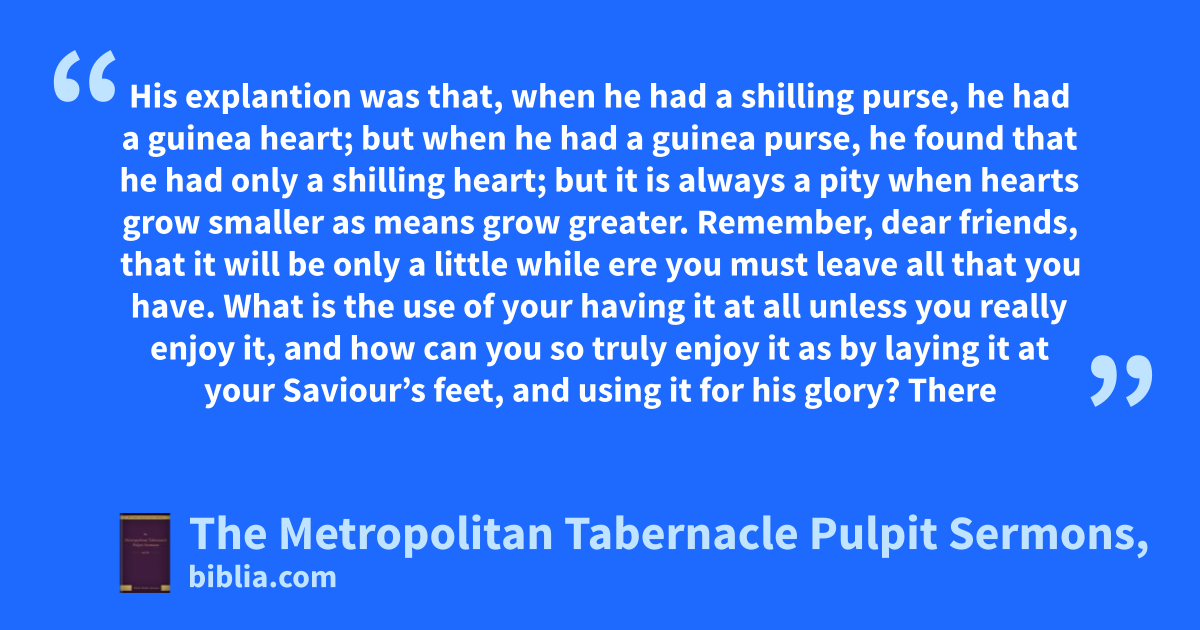 His explantion was that, when he had a shilling purse, he had a guinea heart; but when he had a guinea purse, he found that he had only a shilling heart; but it is always a pity when hearts grow smaller as means grow greater. Remember, dear friends, that it will be only a little while ere you must leave all that you have. What is the use of your having it at all unless you really enjoy it, and how can you so truly enjoy it as by laying it at your Saviour’s feet, and using it for his glory? There