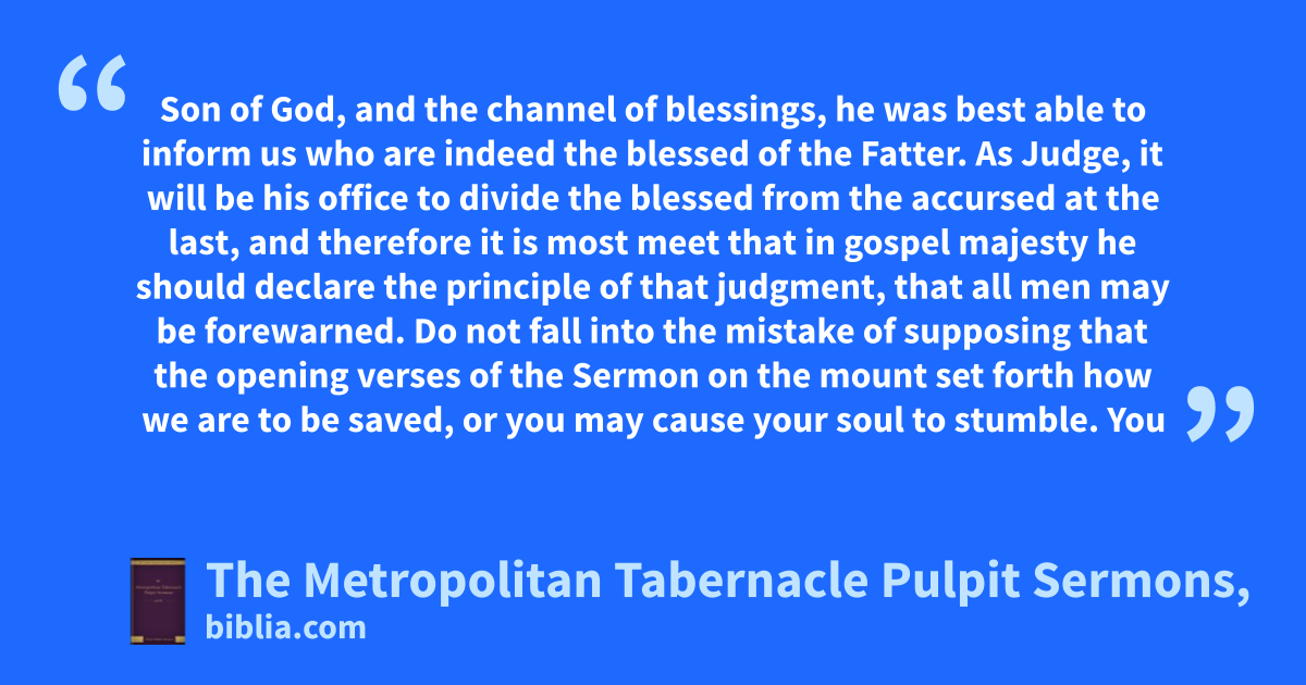 Son of God, and the channel of blessings, he was best able to inform us who are indeed the blessed of the Fatter. As Judge, it will be his office to divide the blessed from the accursed at the last, and therefore it is most meet that in gospel majesty he should declare the principle of that judgment, that all men may be forewarned. Do not fall into the mistake of supposing that the opening verses of the Sermon on the mount set forth how we are to be saved, or you may cause your soul to stumble. You