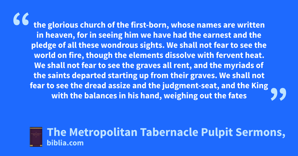 the glorious church of the first-born, whose names are written in heaven, for in seeing him we have had the earnest and the pledge of all these wondrous sights. We shall not fear to see the world on fire, though the elements dissolve with fervent heat. We shall not fear to see the graves all rent, and the myriads of the saints departed starting up from their graves. We shall not fear to see the dread assize and the judgment-seat, and the King with the balances in his hand, weighing out the fates