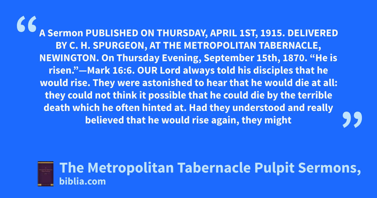 A Sermon PUBLISHED ON THURSDAY, APRIL 1ST, 1915. DELIVERED BY C. H. SPURGEON, AT THE METROPOLITAN TABERNACLE, NEWINGTON. On Thursday Evening, September 15th, 1870. “He is risen.”—Mark 16:6. OUR Lord always told his disciples that he would rise. They were astonished to hear that he would die at all: they could not think it possible that he could die by the terrible death which he often hinted at. Had they understood and really believed that he would rise again, they might