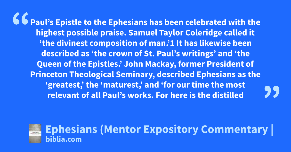 Paul’s Epistle to the Ephesians has been celebrated with the highest possible praise. Samuel Taylor Coleridge called it ‘the divinest composition of man.’1 It has likewise been described as ‘the crown of St. Paul’s writings’ and ‘the Queen of the Epistles.’ John Mackay, former President of Princeton Theological Seminary, described Ephesians as the ‘greatest,’ the ‘maturest,’ and ‘for our time the most relevant of all Paul’s works. For here is the distilled