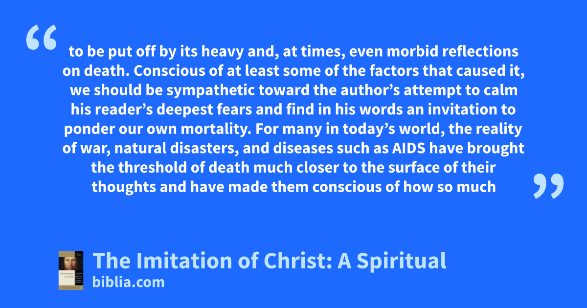 to be put off by its heavy and, at times, even morbid reflections on death. Conscious of at least some of the factors that caused it, we should be sympathetic toward the author’s attempt to calm his reader’s deepest fears and find in his words an invitation to ponder our own mortality. For many in today’s world, the reality of war, natural disasters, and diseases such as AIDS have brought the threshold of death much closer to the surface of their thoughts and have made them conscious of how so much