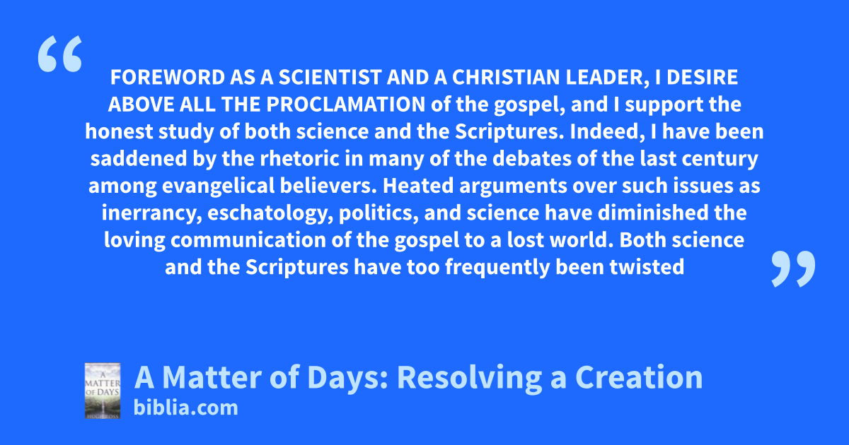 FOREWORD AS A SCIENTIST AND A CHRISTIAN LEADER, I DESIRE ABOVE ALL THE PROCLAMATION of the gospel, and I support the honest study of both science and the Scriptures. Indeed, I have been saddened by the rhetoric in many of the debates of the last century among evangelical believers. Heated arguments over such issues as inerrancy, eschatology, politics, and science have diminished the loving communication of the gospel to a lost world. Both science and the Scriptures have too frequently been twisted