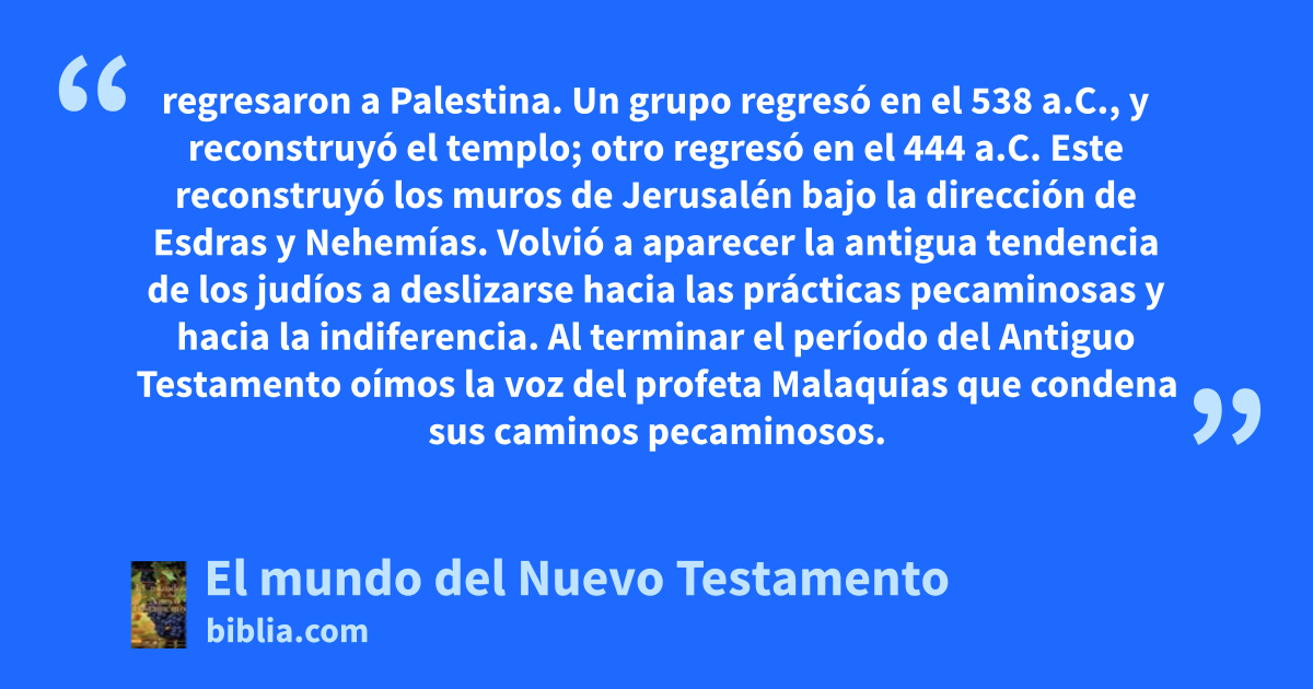 regresaron a Palestina. Un grupo regresó en el 538 a.C., y reconstruyó el templo; otro regresó en el 444 a.C. Este reconstruyó los muros de Jerusalén bajo la dirección de Esdras y Nehemías. Volvió a aparecer la antigua tendencia de los judíos a deslizarse hacia las prácticas pecaminosas y hacia la indiferencia. Al terminar el período del Antiguo Testamento oímos la voz del profeta Malaquías que condena sus caminos pecaminosos.