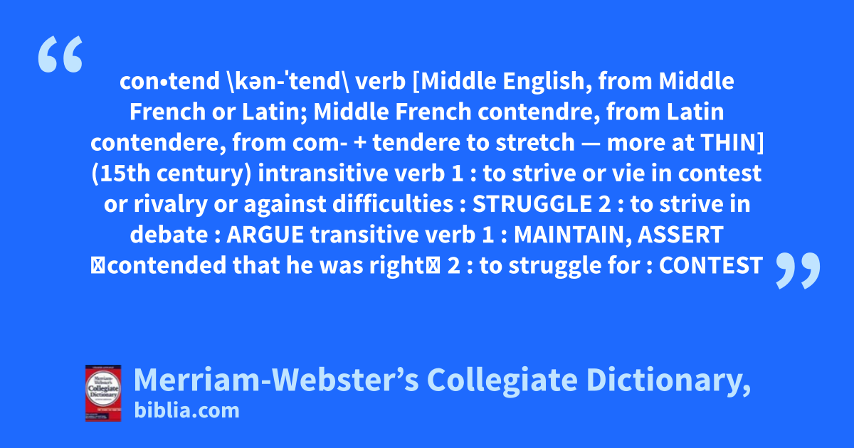 con•tend \kən-ˈtend\ verb [Middle English, from Middle French or Latin; Middle French contendre, from Latin contendere, from com- + tendere to stretch — more at THIN] (15th century) intransitive verb 1 : to strive or vie in contest or rivalry or against difficulties : STRUGGLE 2 : to strive in debate : ARGUE transitive verb 1 : MAINTAIN, ASSERT 〈contended that he was right〉 2 : to struggle for : CONTEST