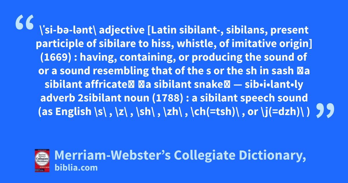 \ˈsi-bə-lənt\ adjective [Latin sibilant-, sibilans, present participle of sibilare to hiss, whistle, of imitative origin] (1669) : having, containing, or producing the sound of or a sound resembling that of the s or the sh in sash 〈a sibilant affricate〉 〈a sibilant snake〉 — sib•i•lant•ly adverb 2sibilant noun (1788) : a sibilant speech sound (as English \s\ , \z\ , \sh\ , \zh\ , \ch(=tsh)\ , or \j(=dzh)\ )