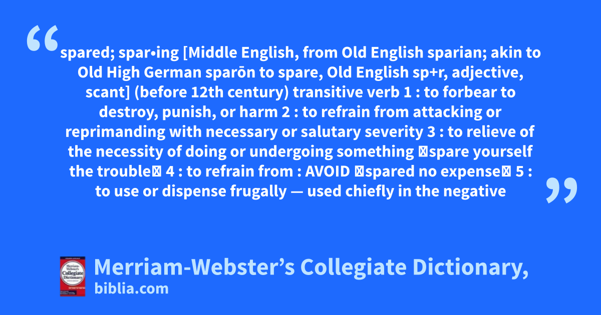spared; spar•ing [Middle English, from Old English sparian; akin to Old High German sparōn to spare, Old English sp+r, adjective, scant] (before 12th century) transitive verb 1 : to forbear to destroy, punish, or harm 2 : to refrain from attacking or reprimanding with necessary or salutary severity 3 : to relieve of the necessity of doing or undergoing something 〈spare yourself the trouble〉 4 : to refrain from : AVOID 〈spared no expense〉 5 : to use or dispense frugally — used chiefly in the negative
