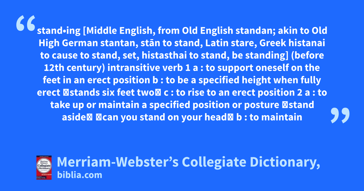 stand•ing [Middle English, from Old English standan; akin to Old High German stantan, stān to stand, Latin stare, Greek histanai to cause to stand, set, histasthai to stand, be standing] (before 12th century) intransitive verb 1 a : to support oneself on the feet in an erect position b : to be a specified height when fully erect 〈stands six feet two〉 c : to rise to an erect position 2 a : to take up or maintain a specified position or posture 〈stand aside〉 〈can you stand on your head〉 b : to maintain