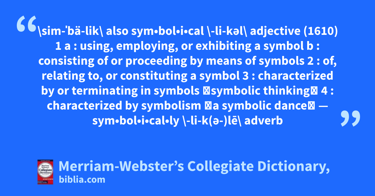 \sim-ˈbä-lik\ also sym•bol•i•cal \-li-kəl\ adjective (1610) 1 a : using, employing, or exhibiting a symbol b : consisting of or proceeding by means of symbols 2 : of, relating to, or constituting a symbol 3 : characterized by or terminating in symbols 〈symbolic thinking〉 4 : characterized by symbolism 〈a symbolic dance〉 — sym•bol•i•cal•ly \-li-k(ə-)lē\ adverb