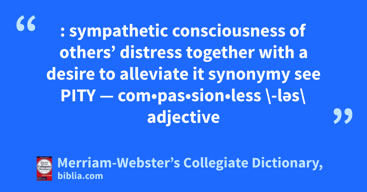 : sympathetic consciousness of others’ distress together with a desire to alleviate it synonymy see PITY — com•pas•sion•less \-ləs\ adjective