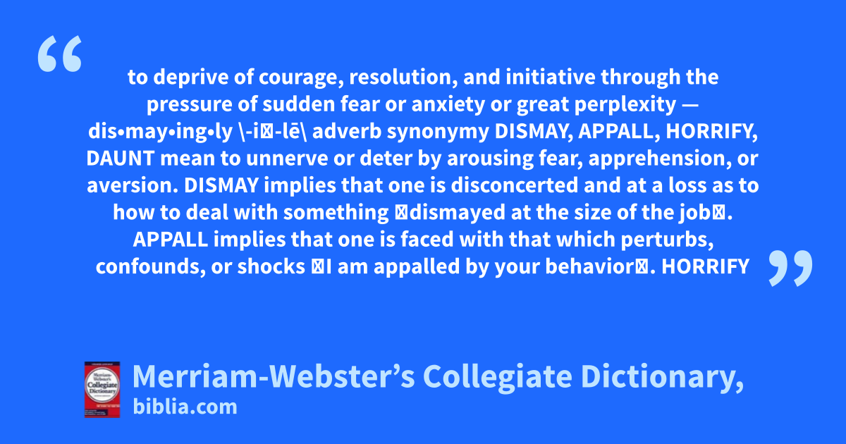 to deprive of courage, resolution, and initiative through the pressure of sudden fear or anxiety or great perplexity — dis•may•ing•ly \-iŋ-lē\ adverb synonymy DISMAY, APPALL, HORRIFY, DAUNT mean to unnerve or deter by arousing fear, apprehension, or aversion. DISMAY implies that one is disconcerted and at a loss as to how to deal with something 〈dismayed at the size of the job〉. APPALL implies that one is faced with that which perturbs, confounds, or shocks 〈I am appalled by your behavior〉. HORRIFY
