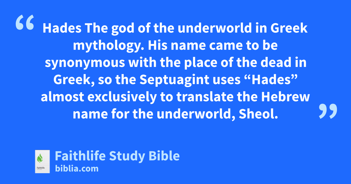 Hades The god of the underworld in Greek mythology. His name came to be synonymous with the place of the dead in Greek, so the Septuagint uses “Hades” almost exclusively to translate the Hebrew name for the underworld, Sheol.