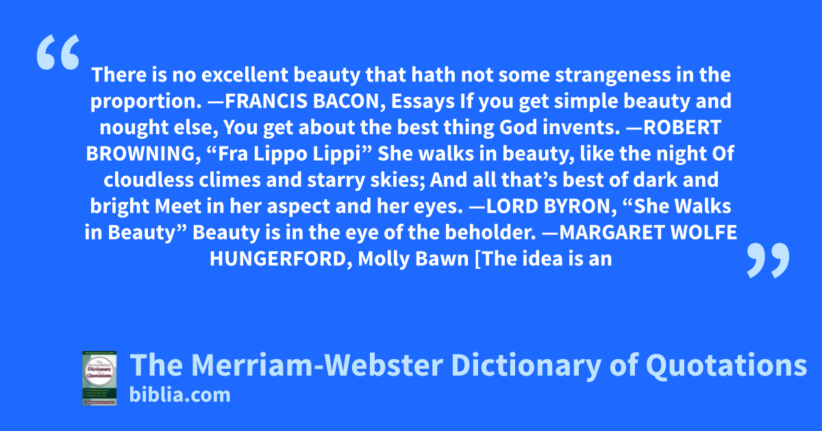 There is no excellent beauty that hath not some strangeness in the proportion. —FRANCIS BACON, Essays If you get simple beauty and nought else, You get about the best thing God invents. —ROBERT BROWNING, “Fra Lippo Lippi” She walks in beauty, like the night Of cloudless climes and starry skies; And all that’s best of dark and bright Meet in her aspect and her eyes. —LORD BYRON, “She Walks in Beauty” Beauty is in the eye of the beholder. —MARGARET WOLFE HUNGERFORD, Molly Bawn [The idea is an