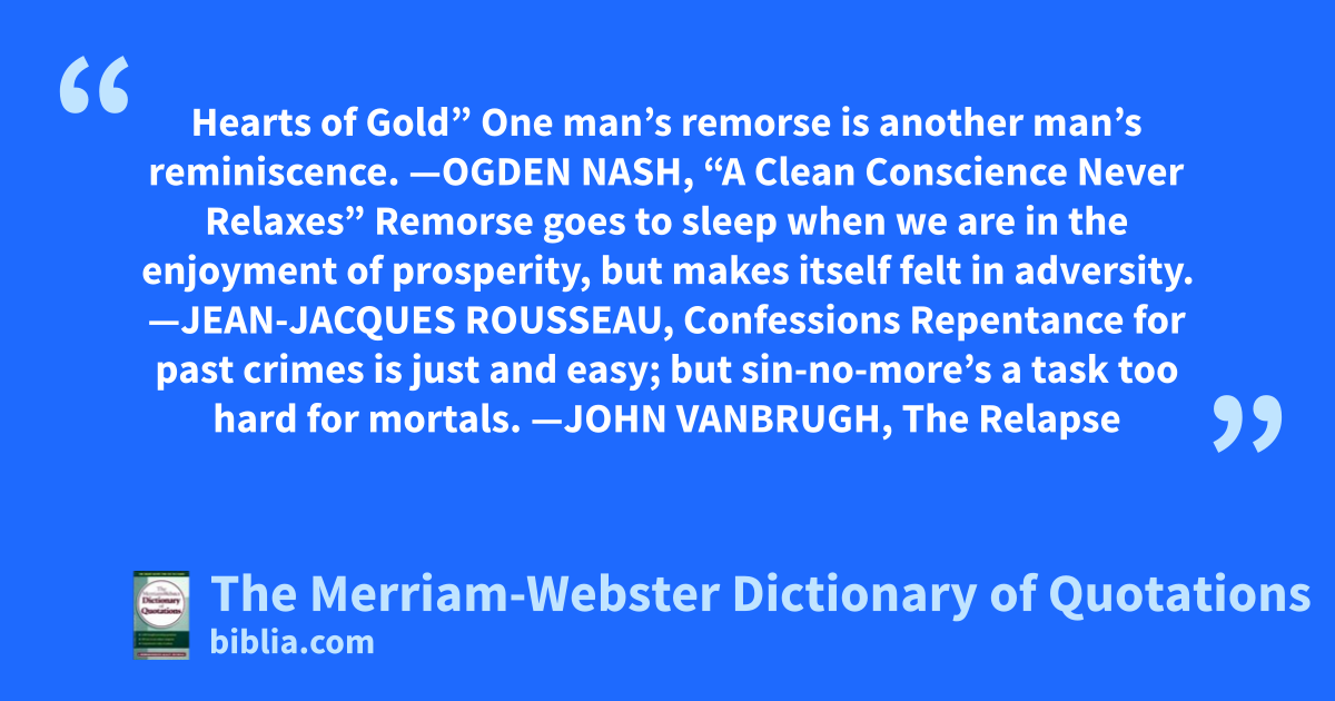 Hearts of Gold” One man’s remorse is another man’s reminiscence. —OGDEN NASH, “A Clean Conscience Never Relaxes” Remorse goes to sleep when we are in the enjoyment of prosperity, but makes itself felt in adversity. —JEAN-JACQUES ROUSSEAU, Confessions Repentance for past crimes is just and easy; but sin-no-more’s a task too hard for mortals. —JOHN VANBRUGH, The Relapse