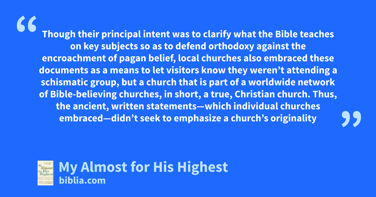 Though their principal intent was to clarify what the Bible teaches on key subjects so as to defend orthodoxy against the encroachment of pagan belief, local churches also embraced these documents as a means to let visitors know they weren’t attending a schismatic group, but a church that is part of a worldwide network of Bible-believing churches, in short, a true, Christian church. Thus, the ancient, written statements—which individual churches embraced—didn’t seek to emphasize a church’s originality