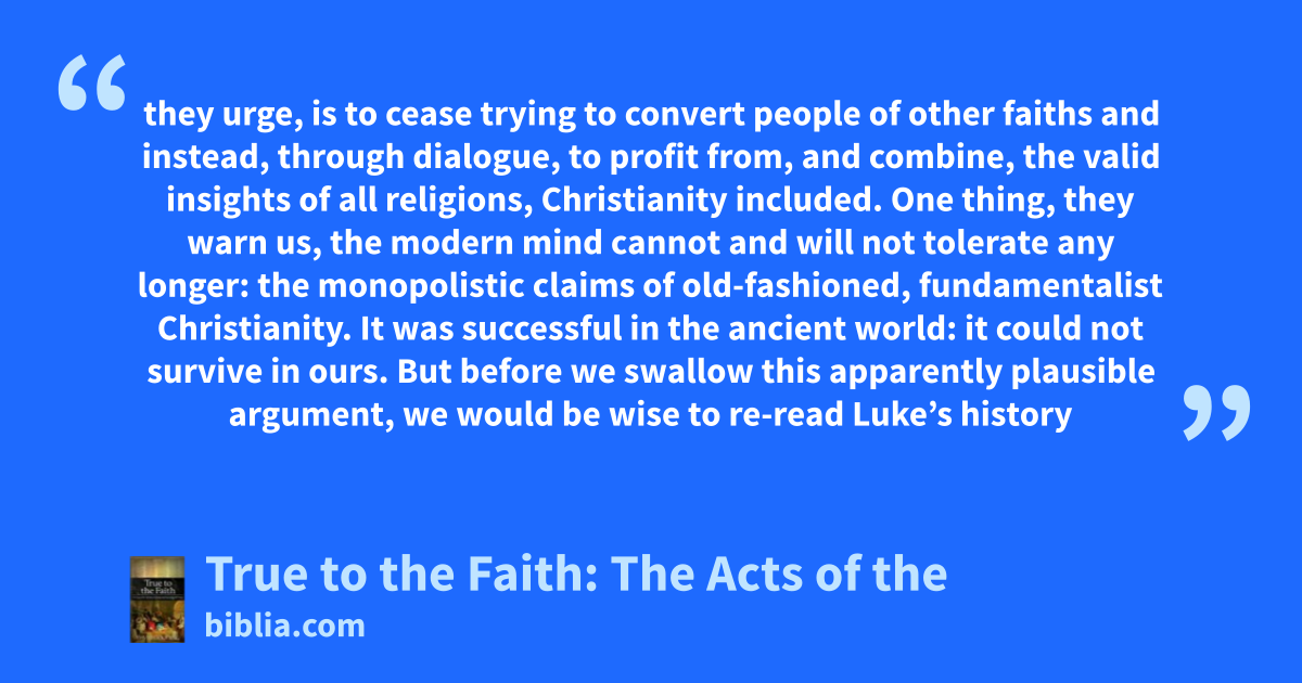 they urge, is to cease trying to convert people of other faiths and instead, through dialogue, to profit from, and combine, the valid insights of all religions, Christianity included. One thing, they warn us, the modern mind cannot and will not tolerate any longer: the monopolistic claims of old-fashioned, fundamentalist Christianity. It was successful in the ancient world: it could not survive in ours. But before we swallow this apparently plausible argument, we would be wise to re-read Luke’s history