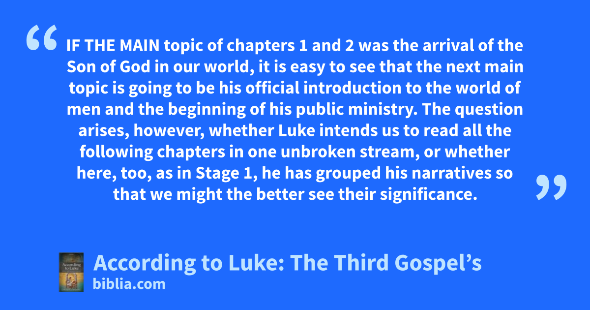 IF THE MAIN topic of chapters 1 and 2 was the arrival of the Son of God in our world, it is easy to see that the next main topic is going to be his official introduction to the world of men and the beginning of his public ministry. The question arises, however, whether Luke intends us to read all the following chapters in one unbroken stream, or whether here, too, as in Stage 1, he has grouped his narratives so that we might the better see their significance.