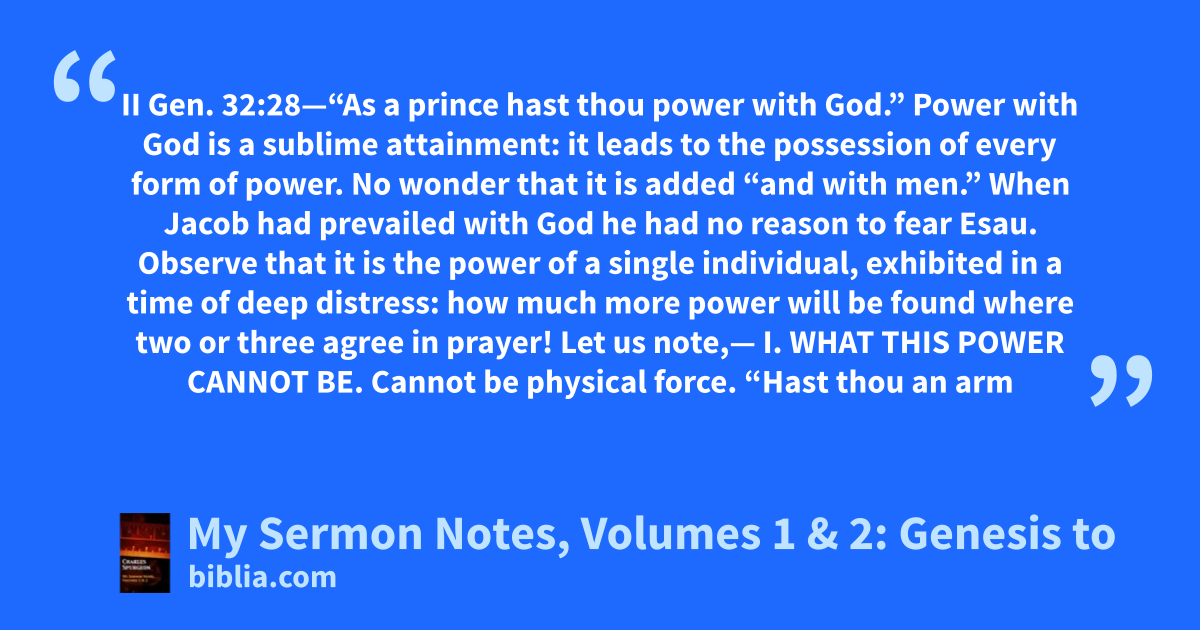 II Gen. 32:28—“As a prince hast thou power with God.” Power with God is a sublime attainment: it leads to the possession of every form of power. No wonder that it is added “and with men.” When Jacob had prevailed with God he had no reason to fear Esau. Observe that it is the power of a single individual, exhibited in a time of deep distress: how much more power will be found where two or three agree in prayer! Let us note,— I. WHAT THIS POWER CANNOT BE. Cannot be physical force. “Hast thou an arm