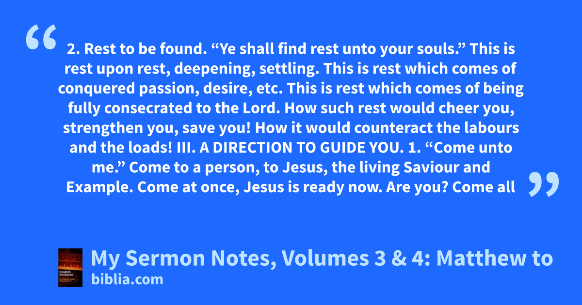 2. Rest to be found. “Ye shall find rest unto your souls.” This is rest upon rest, deepening, settling. This is rest which comes of conquered passion, desire, etc. This is rest which comes of being fully consecrated to the Lord. How such rest would cheer you, strengthen you, save you! How it would counteract the labours and the loads! III. A DIRECTION TO GUIDE YOU. 1. “Come unto me.” Come to a person, to Jesus, the living Saviour and Example. Come at once, Jesus is ready now. Are you? Come all