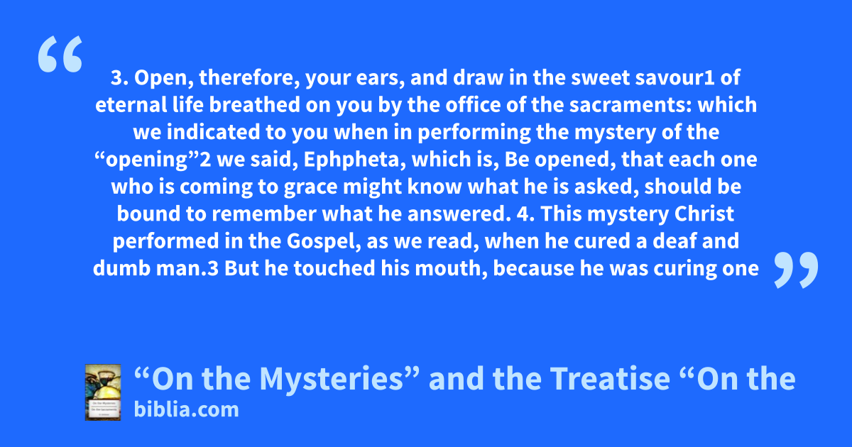 3. Open, therefore, your ears, and draw in the sweet savour1 of eternal life breathed on you by the office of the sacraments: which we indicated to you when in performing the mystery of the “opening”2 we said, Ephpheta, which is, Be opened, that each one who is coming to grace might know what he is asked, should be bound to remember what he answered. 4. This mystery Christ performed in the Gospel, as we read, when he cured a deaf and dumb man.3 But he touched his mouth, because he was curing one