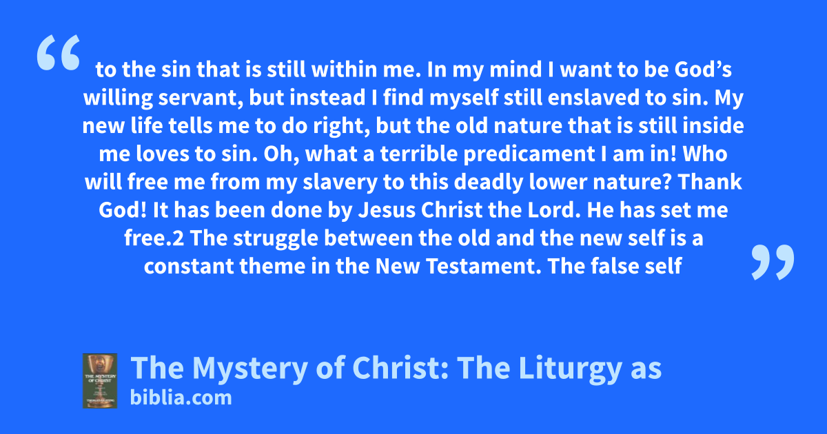 to the sin that is still within me. In my mind I want to be God’s willing servant, but instead I find myself still enslaved to sin. My new life tells me to do right, but the old nature that is still inside me loves to sin. Oh, what a terrible predicament I am in! Who will free me from my slavery to this deadly lower nature? Thank God! It has been done by Jesus Christ the Lord. He has set me free.2 The struggle between the old and the new self is a constant theme in the New Testament. The false self