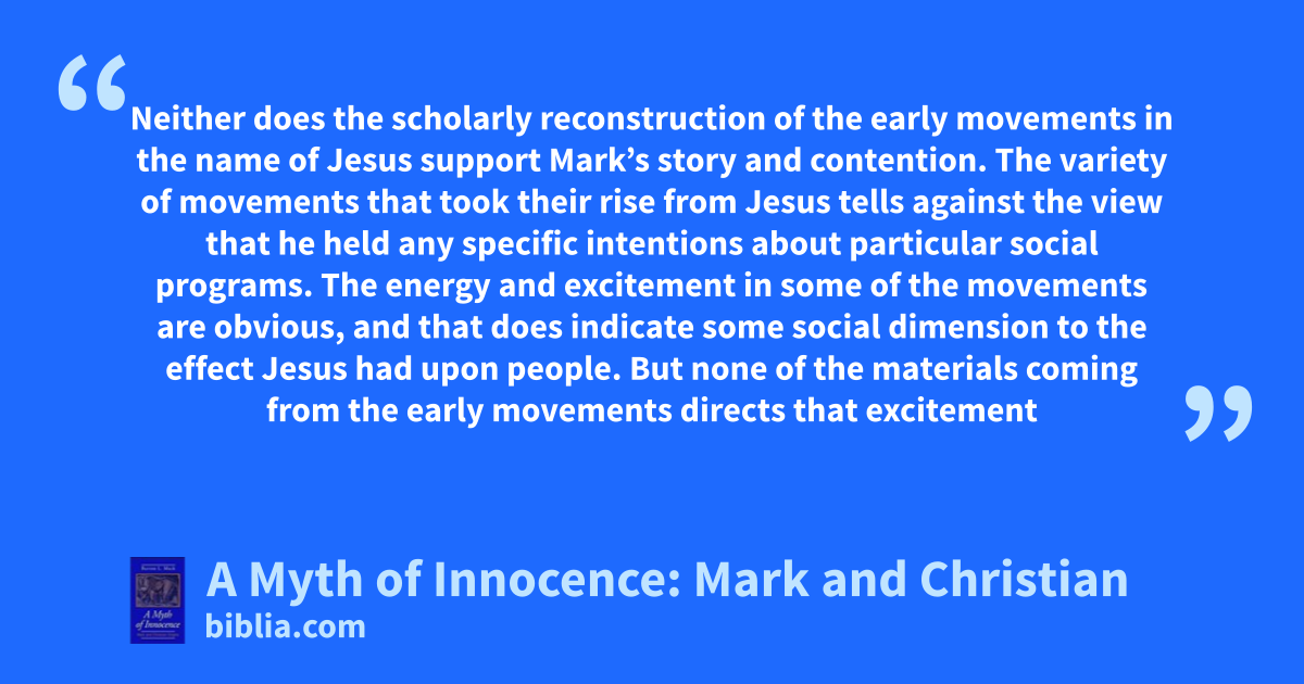 Neither does the scholarly reconstruction of the early movements in the name of Jesus support Mark’s story and contention. The variety of movements that took their rise from Jesus tells against the view that he held any specific intentions about particular social programs. The energy and excitement in some of the movements are obvious, and that does indicate some social dimension to the effect Jesus had upon people. But none of the materials coming from the early movements directs that excitement
