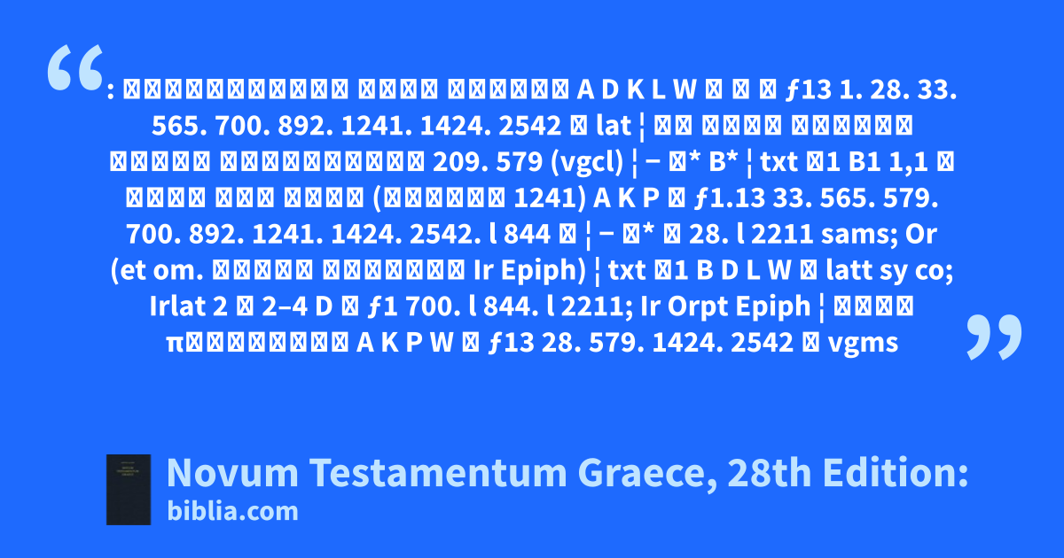 : ⸂ευαγγελιον κατα Μαρκον A D K L W Γ Δ Θ ƒ13 1. 28. 33. 565. 700. 892. 1241. 1424. 2542 𝔪 lat ¦ το κατα Μαρκον αγιον ευαγγελιον 209. 579 (vgcl) ¦ − א* B* ¦ txt א1 B1 1,1 ⸂ υιου του θεου (κυριου 1241) A K P Δ ƒ1.13 33. 565. 579. 700. 892. 1241. 1424. 2542. l 844 𝔪 ¦ − א* Θ 28. l 2211 sams; Or (et om. Ιησου Χριστου Ir Epiph) ¦ txt א1 B D L W Γ latt sy co; Irlat 2 ⸂ 2–4 D Θ ƒ1 700. l 844. l 2211; Ir Orpt Epiph ¦ τοις προφηταις A K P W Γ ƒ13 28. 579. 1424. 2542 𝔪 vgms