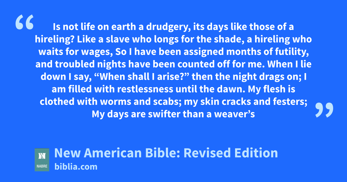 Is not life on earth a drudgery, its days like those of a hireling? Like a slave who longs for the shade, a hireling who waits for wages, So I have been assigned months of futility, and troubled nights have been counted off for me. When I lie down I say, “When shall I arise?” then the night drags on; I am filled with restlessness until the dawn. My flesh is clothed with worms and scabs; my skin cracks and festers; My days are swifter than a weaver’s