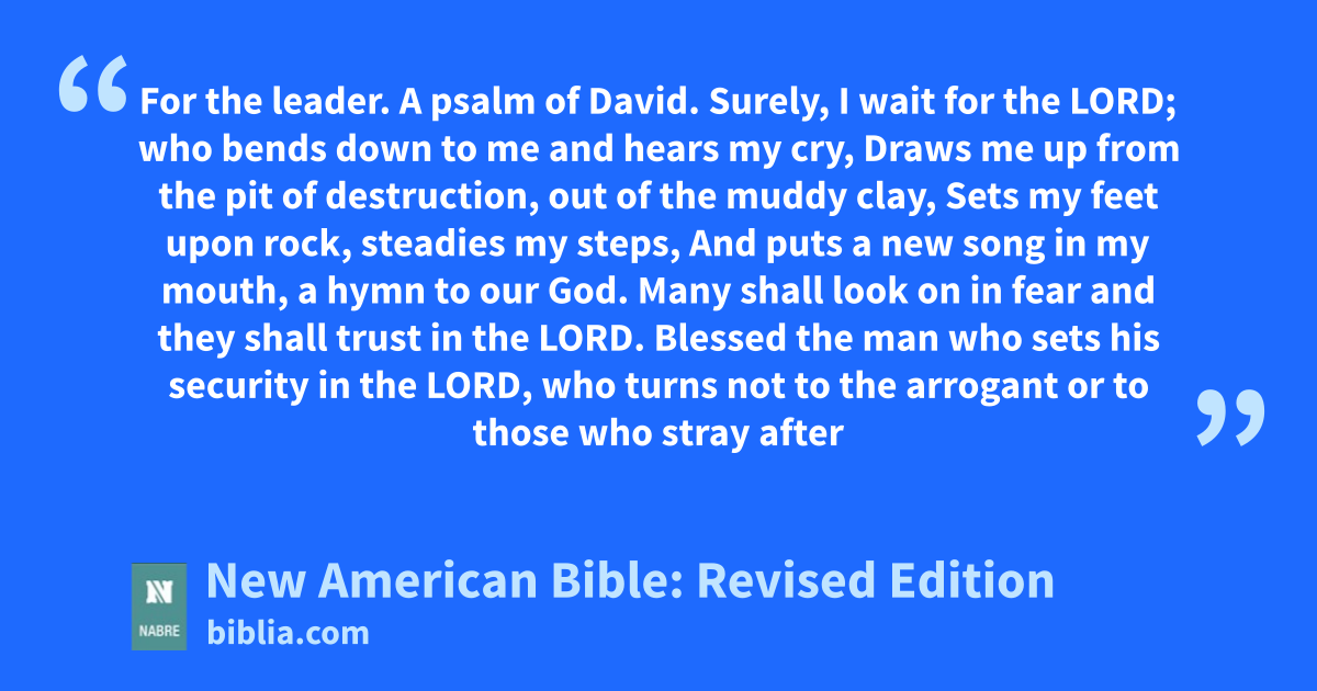 For the leader. A psalm of David. Surely, I wait for the LORD; who bends down to me and hears my cry, Draws me up from the pit of destruction, out of the muddy clay, Sets my feet upon rock, steadies my steps, And puts a new song in my mouth, a hymn to our God. Many shall look on in fear and they shall trust in the LORD. Blessed the man who sets his security in the LORD, who turns not to the arrogant or to those who stray after