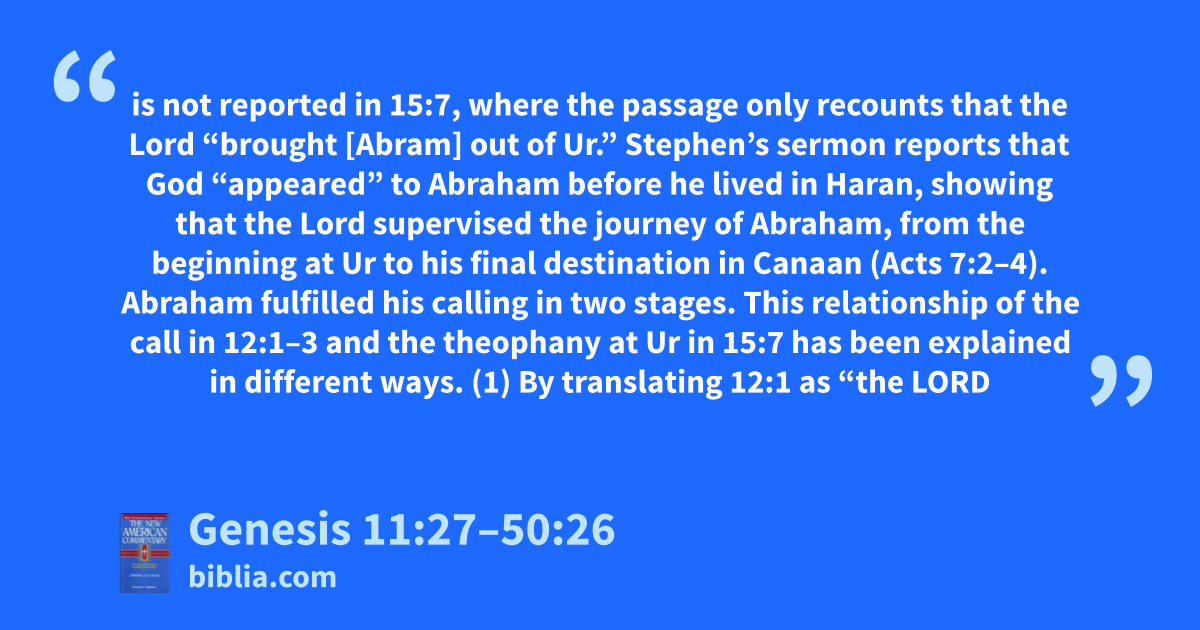 is not reported in 15:7, where the passage only recounts that the Lord “brought [Abram] out of Ur.” Stephen’s sermon reports that God “appeared” to Abraham before he lived in Haran, showing that the Lord supervised the journey of Abraham, from the beginning at Ur to his final destination in Canaan (Acts 7:2–4). Abraham fulfilled his calling in two stages. This relationship of the call in 12:1–3 and the theophany at Ur in 15:7 has been explained in different ways. (1) By translating 12:1 as “the LORD