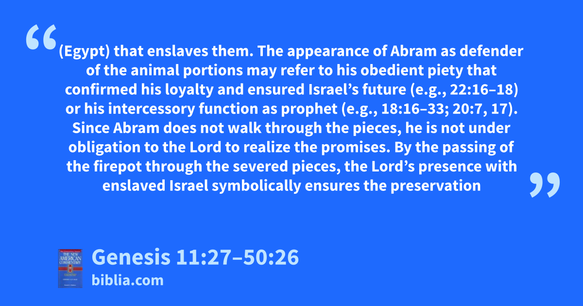 (Egypt) that enslaves them. The appearance of Abram as defender of the animal portions may refer to his obedient piety that confirmed his loyalty and ensured Israel’s future (e.g., 22:16–18) or his intercessory function as prophet (e.g., 18:16–33; 20:7, 17). Since Abram does not walk through the pieces, he is not under obligation to the Lord to realize the promises. By the passing of the firepot through the severed pieces, the Lord’s presence with enslaved Israel symbolically ensures the preservation