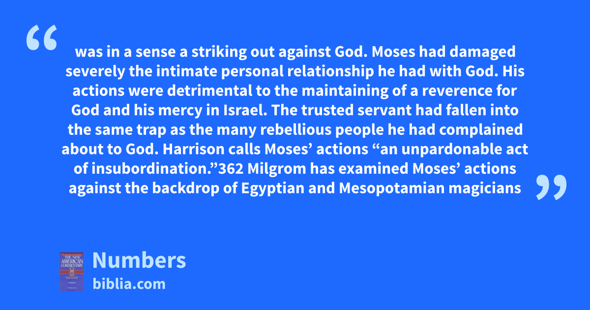 was in a sense a striking out against God. Moses had damaged severely the intimate personal relationship he had with God. His actions were detrimental to the maintaining of a reverence for God and his mercy in Israel. The trusted servant had fallen into the same trap as the many rebellious people he had complained about to God. Harrison calls Moses’ actions “an unpardonable act of insubordination.”362 Milgrom has examined Moses’ actions against the backdrop of Egyptian and Mesopotamian magicians