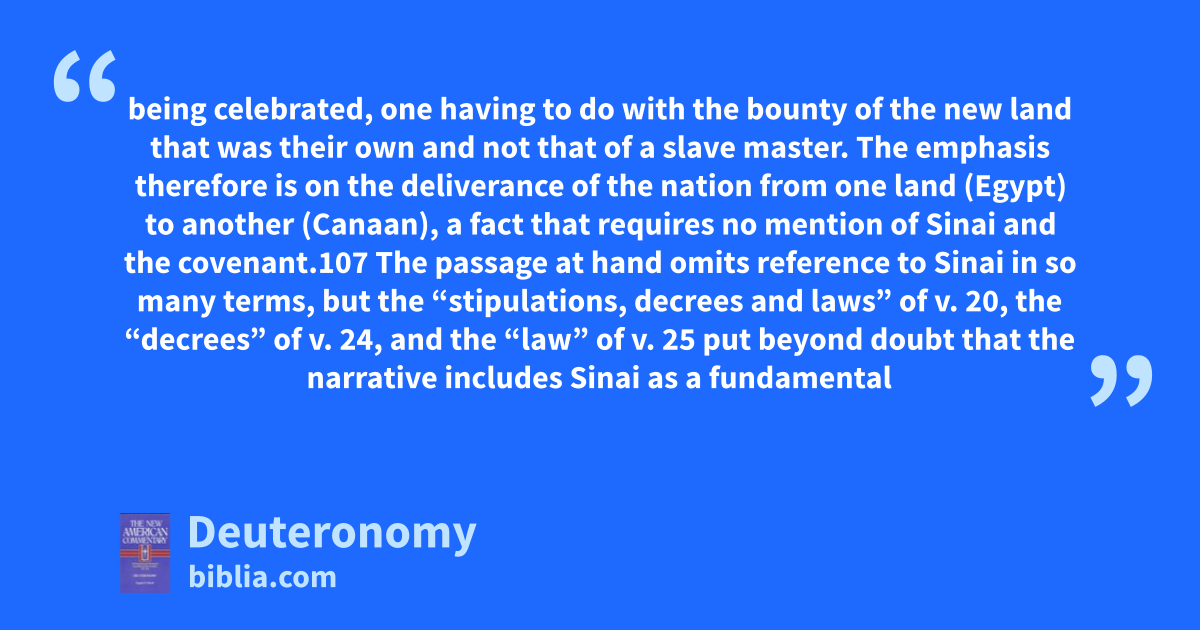 being celebrated, one having to do with the bounty of the new land that was their own and not that of a slave master. The emphasis therefore is on the deliverance of the nation from one land (Egypt) to another (Canaan), a fact that requires no mention of Sinai and the covenant.107 The passage at hand omits reference to Sinai in so many terms, but the “stipulations, decrees and laws” of v. 20, the “decrees” of v. 24, and the “law” of v. 25 put beyond doubt that the narrative includes Sinai as a fundamental